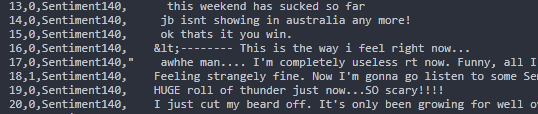 To train and test the classification models of each application, this dataset of 1.6 million tweets was used in csv format with each line representing a document/tweet with its unique ID, class label, and tweet text as seen below.