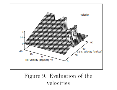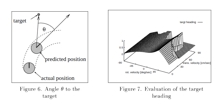 With the remaining admissible velocity samples, the dynamic window approach mainly considers the following three discretized cost functions for choosing the best velocity that maximizes the total objective function.