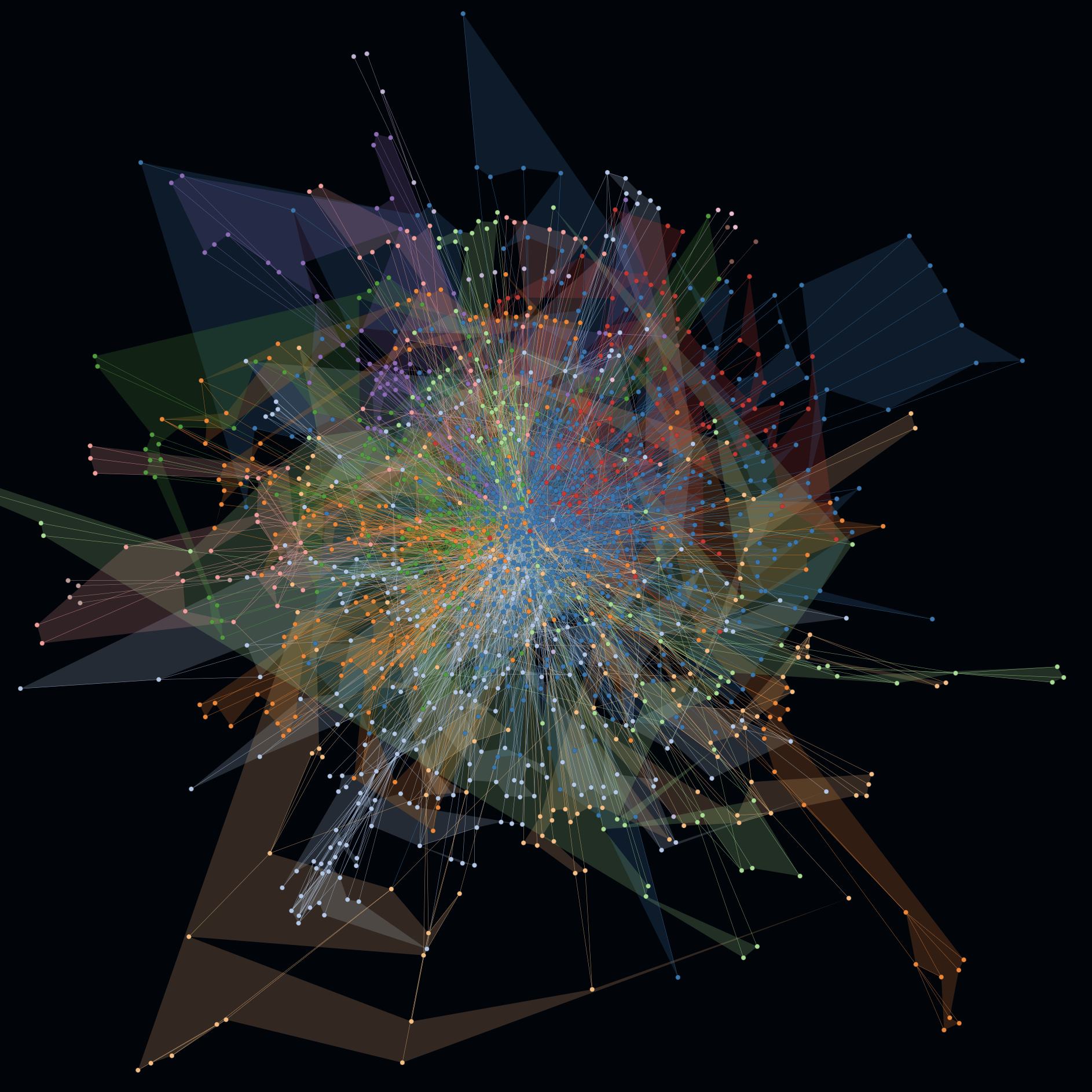 "A BIG BALL OF MUD is haphazardly structured, sprawling, sloppy, duct-tape and bailing wire, spaghetti code jungle" (B. Foote, J. Yoder, 1997). This kind of graph often represents a less optimal architecture. To verify this kind of spaghetti code jungle, one can simply enable hull rendering for all clusters to finally determine: there is only one big cluster after all.