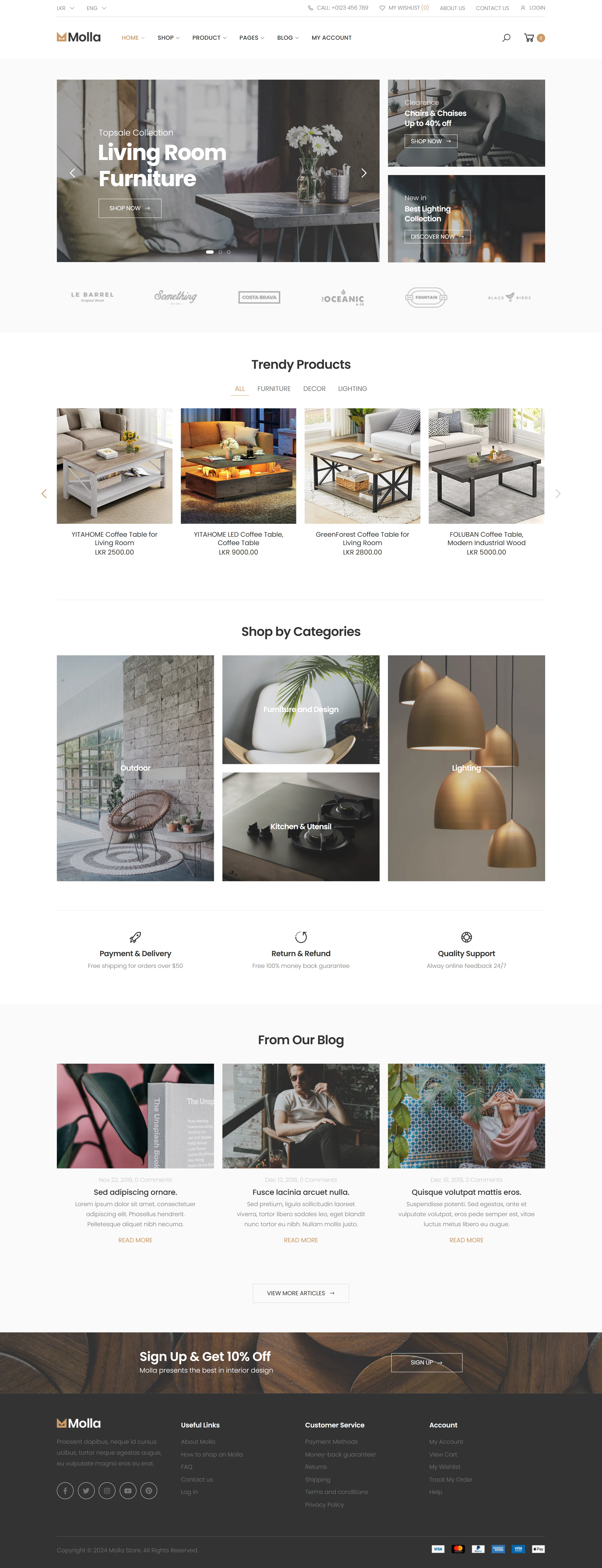 Molla Furniture is a robust and dynamic e-commerce application that allows users to browse, search, and purchase furniture and decor items online. Designed with a focus on simplicity and user experience, this project demonstrates how to integrate a modern tech stack for developing a complete web application.