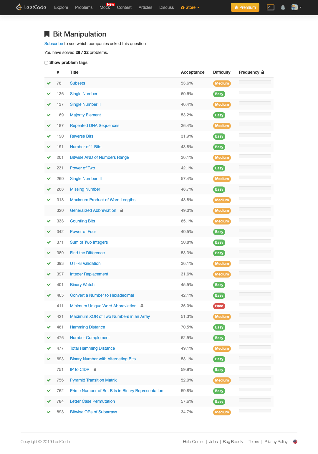 - 异或的特性。第 136 题,第 268 题,第 389 题,第 421 题,