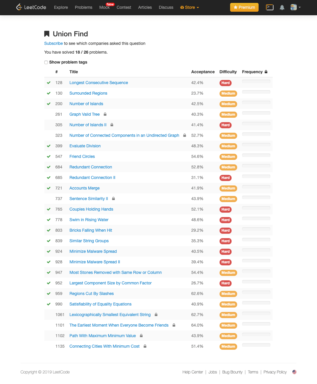 - 灵活使用并查集的思想,熟练掌握并查集的模板,模板中有两种并查集的实现方式,一种是路径压缩 + 秩优化的版本,另外一种是计算每个集合中元素的个数 + 最大集合元素个数的版本,这两种版本都有各自使用的地方。能使用第一类并查集模板的题目有:第 128 题,第 130 题,第 547 题,第 684 题,第 721 题,第 765 题,第 778 题,第 839 题,第 924 题,第 928 题,第 947 题,第 952 题,第 959 题,第 990 题。能使用第二类并查集模板的题目有:第 803 题,第 952 题。第 803 题秩优化和统计集合个数这些地方会卡时间,如果不优化,会 TLE。