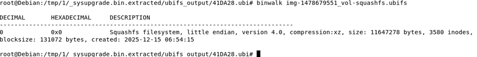 В результате у нас появилась еще одна папка содержащая UBIFS, образ внутри которого, судя по названию, содержится файловая система squashFS: