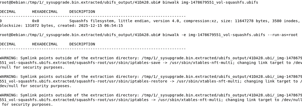 └── Various Peripheral Controllers Детально изучая этот файл, мы понимаем, что речь идёт о пятипортовом Wi-Fi 6 AX роутере. Мы видим производителя, марку и модель, но по вполне понятным причинам эти данные я упоминать не буду. Собственно, данный dts файл может стать отправной точкой для сборки своей собственной прошивки для данного устройства на основе исходников OpenWRT. Но поскольку это не тема нашей сегодняшней статьи, давайте продолжим ковырять sysupgrade.bin дальше. И следующим шагом давайте попробуем извлечь его содержимое, воспользовавшись опять же binwalk с флагом -e и при этом у меня попросили указать флаг --run-as=root.