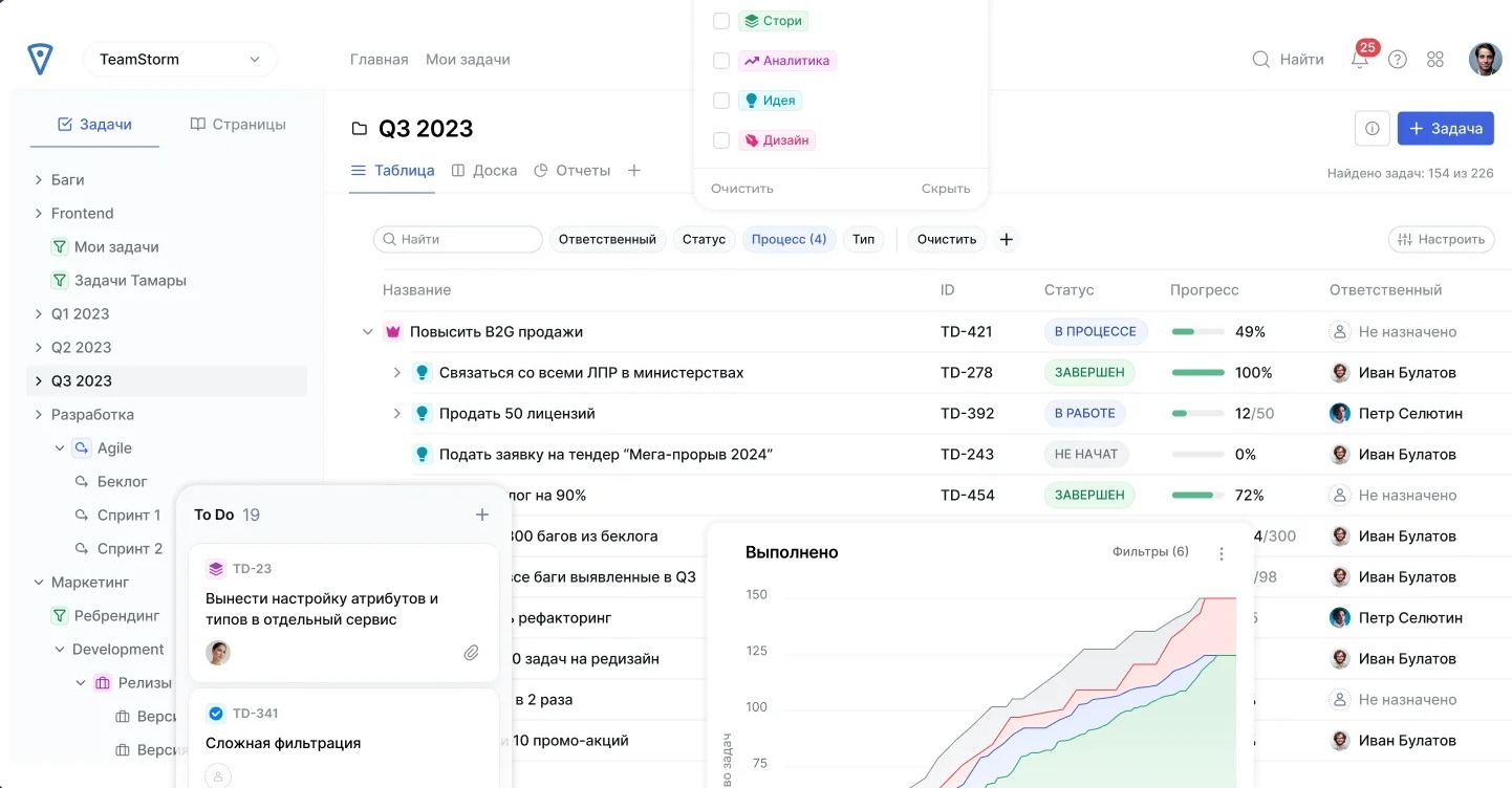 отчёты и аналитика по задачам, проектам и сотрудникам;