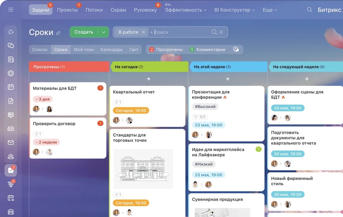 Такие сервисы могут быть как комплексными платформами, которые закрывают несколько процессов одновременно, например, управление задачами, сделками, коммуникацию и аналитику, так и более простыми решениями для планирования проектов.
