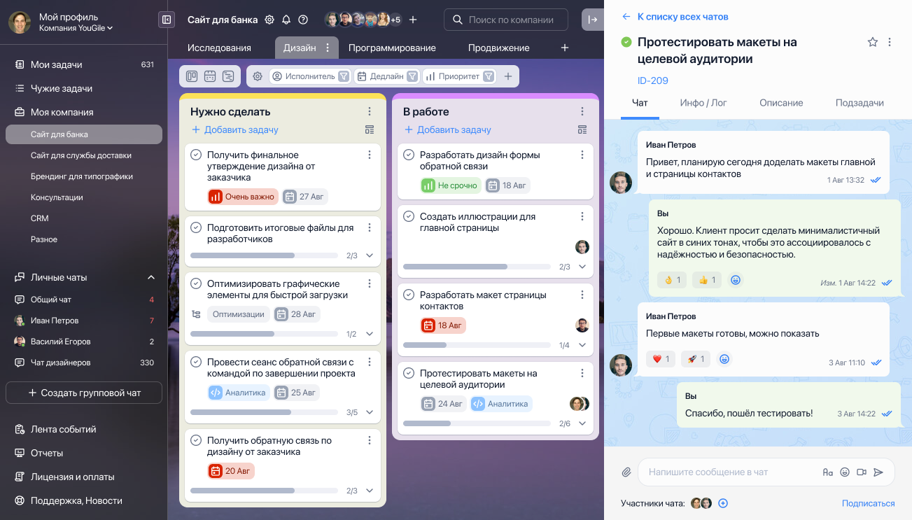 Мессенджер ускоряет закрытие задач. Общение ведётся как в привычном мессенджере, но по работе. В каждой задаче есть чат: вся информация остаётся в нём, поэтому договорённости и дальнейшие шаги не теряются.