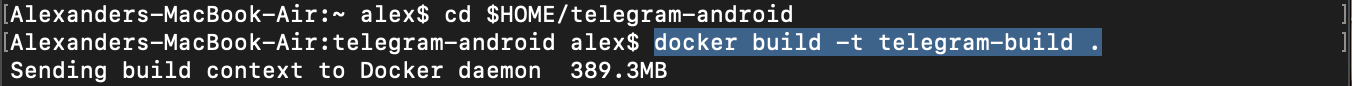 Open Terminal, run the commands:cd $HOME/telegram-androiddocker build -t telegram-build .