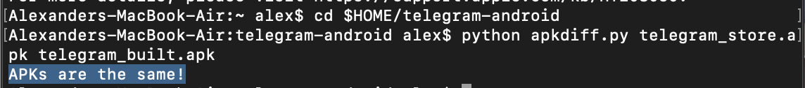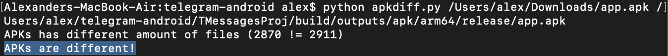 To compare Direct and Huawei Store versions, open Terminal, run the commands:cd $HOME/telegram-androidpython apkdiff.py telegram_store.apk telegram_built.apk
