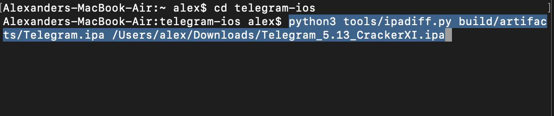 Runpython3 tools/ipadiff.py build/artifacts/Telegram.ipa PATH-TO-THE-IPA-FILE-FROM-STEP-9