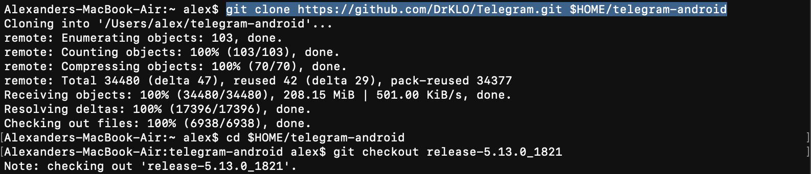 Open Terminal, run the commands:git clone https://github.com/DrKLO/Telegram.git $HOME/telegram-androidcd $HOME/telegram-androidgit checkout release-{VERSION AND BUILD NUMBER FROM STEP 2}