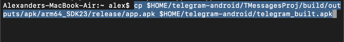 Copy this APK to the root source directory by running this command in Terminal:cp $HOME/telegram-android/TMessagesProj/build/outputs/apk/afat/release/app.apk $HOME/telegram-android/telegram_built.apk