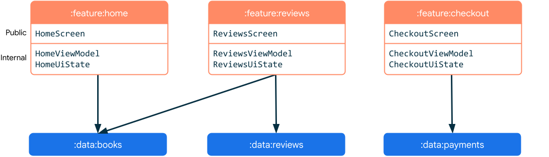 - Encapsulate all data and business logic of a certain domain: Each data module should be responsible for handling data that represents a certain domain. It can handle many types of data as long as they are related.