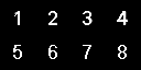 A flipbook texture sheet that contains eight sub-images of the numbers 1-8 across two rows of four columns. The first row contains the numbers 1-4 and the second row contains the numbers 5-8.