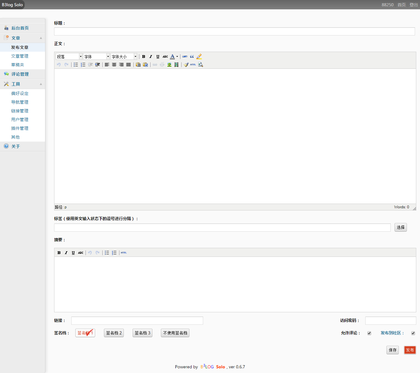 - You can not get rid of the "Powered by B3log 开源" from any page, even which you made