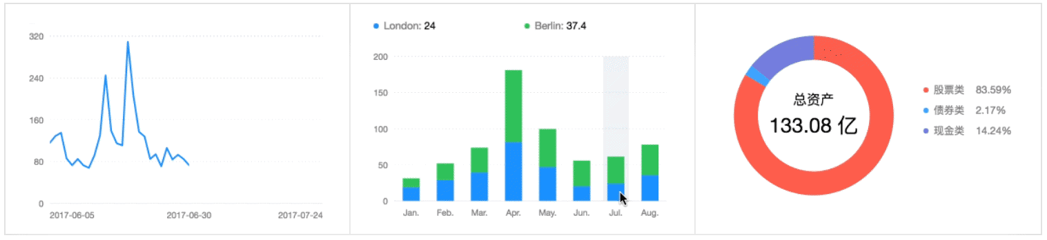 With the power of grammar of graphics, F2 supports data-driven 50+ chart types(the amount can be even more, which is depended on you) including classical charts such as line, column/bar chart, pie chart, scatter plot, gauges, etc. Additionally, F2 also provides feature-riched chart components, such as Tooltip, Legend and Guide.