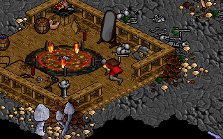 Нас поражало буквально всё: детально анимированные NPC, стильность инвентаря и меню, «бумажная кукла» персонажа, которую можно было одеть в найденный неподалёку плащ, умение альтер эго прыгать и подтягиваться, залезая на стены и крыши низких зданий, возможность разбрасывать предметы и даже строгий распорядок дня местной «снежной королевы». В РПГ мы до этого не играли ни разу, поэтому нас приводила в восторг такая ерунда, как возможность найти за городом опасную пещеру и поискать там сокровища! Целый месяц мы безостановочно бегали по южному побережью острова Моргэлин, изучали паганские законы и обычаи, вооружались бумажным словарём и трудолюбиво переводили диалоги, пытаясь разобраться, что к чему. Мы подружились с одноногим трактирщиком, — он начал нас узнавать и запомнил любимую выпивку. Потом мы попытались перепрыгнуть через лужу (и утонули в ней), нашли первый кинжал, попытались напасть на стражника (огребли), потом на сельскохозяйственную скотину (тоже огребли), потом на королеву‑чародейку (огребли зрелищно). Мы залезли в каждый дом, копались в каждом шкафу, вручную перекладывая тряпки, чтобы обнаружить под ними вожделенный ключ неизвестно от чего (или груду костей — как повезёт), мы прошли полосу магических препятствий, решили пару головоломок, двадцать раз подорвались на сундуках с ловушками, едва унесли ноги от жуткого призрака, кривыми путями пробрались на сокрытое плато и познакомились с отшельником Митраном, который дал нам первый совет по существу (и попытались напасть на него — с предсказуемым результатом). Потом мир вдруг замер. Последнее полученное задание завело нас в тупик, НПЦ начали повторяться... Но впечатления ещё были свежи — и мы продолжили самозабвенно исследовать мир! Спасаясь от роты зомбей, мы забрели в какую‑то разваленную хижину, провалились сквозь пол и оказались в древнем каменном лабиринте с ловушками, переключателями, подземным озером и периодически тонущими в нём камушками, по которым пришлось прыгать, прикидывая не только дистанцию, но и ритм. Нас не испугала даже крайне кривая система прыжков в непатченной версии. Вычислить расстояние можно было только на практике, причём персонаж, приземляясь, норовил запнуться об какой‑нибудь пиксель, громко плюхнуться в воду — и всё… Могильный камень, «Here lies the Avatar. Rest in peace». А загрузка сохранения на Intel 486SX занимала минут пять, если не больше. Но какова подача! В процессе странствий по лабиринту мы прочли массу велеречивых предостережений смельчаку, покусившемуся на легендарную волшебную булаву Slayer, что покоится в недрах подземелья, и мы отыскали эту булаву! А найдя сразу опробовали на ближайшем скелете. Скелет, правда, поднялся и злопамятно дал нам по шее, вынудив позорно телепортироваться, но это зашло как часть великого похода за сокровищем и впечатления не испортило.