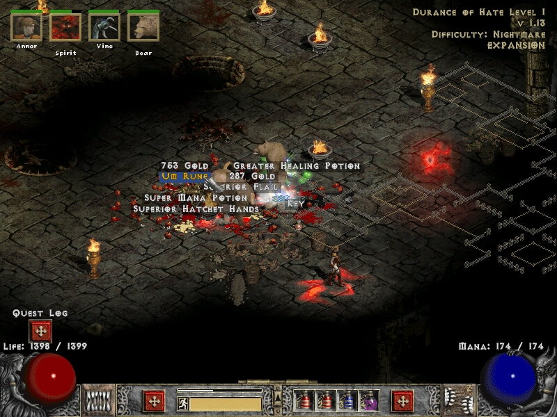 Мало, кстати, одной цели — если играешь один, Diablo 2 за каждым углом может подсунуть неприятный сюрприз. А это делает игру интересной, вехи в виде боссов — значимыми, при этом такая особенность многих «дьябло‑киллеров» как gear check здесь отсутствует. Как следствие даже наиграв за одного перса 60+ часов ты не становишься настолько крут, что разрываешь в щи последние уровни, всегда есть опасность словить «халат». Хотя в дьябле таки нет баланса, но не в этой части — игра если сложная, то всё время сложная. А «отправлять персов на Гавайи» (© народ) с амазон‑базина, то есть пройти игру и больше не трогать данного персонажа, оказывается даже приятно, особенно после вымученной победы над Древними, которые чаще сложнее, чем финальный босс — Баал.