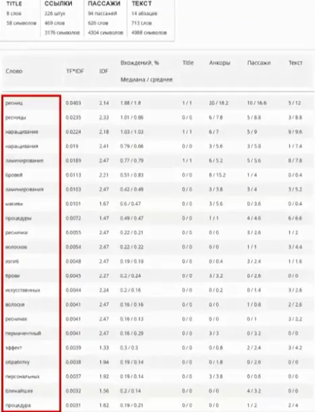 МегаИндекс выдал нам список слов: "ресницы", "наращивание", "ламинирование", "брови", "макияж", "процедуры", "эффект", "волоски", "перманентный" и т.д.