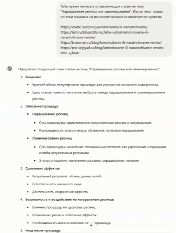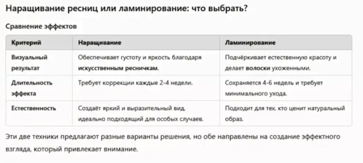"Представь, что ты копирайтер, и напиши подробный текст на тему 'Наращивание или ламинирование ресниц: что выбрать?' Целевая аудитория — женщины 25-40 лет. Используй следующую структуру: [вставляем структуру из шага 4]. Включи в текст следующие слова и выдели их жирным: [вставляем LSI-запросы]"