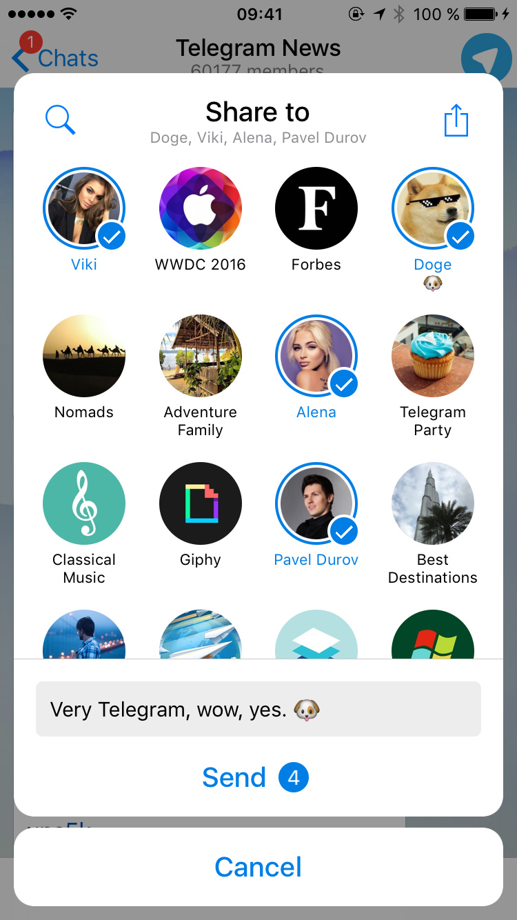 Starting today, our iOS users can easily share photos and videos to other Telegram chats with a comment, or send them to other apps.