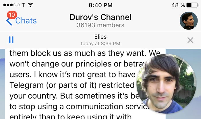 While watching a video message, you can freely browse your other chats – the video will pop up in a corner and continue playing. You can move it around the screen and pause it from anywhere in Telegram. Cool, eh? Well, there's more: